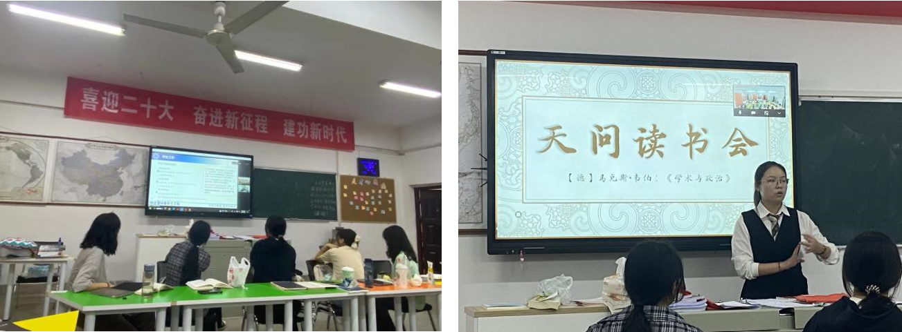 在天问读书环节,师生围坐一圈,以有序接龙、放声朗读的形式读完了《学术与政治》中《学术作为一种志业》的第一至第四部分,并进行了集中讨论和互动分享。特别是在王德洲、丁婕、陈思颖、冯乐茹、潘子怡等同学的积极参与和互动答疑下,大家展开了激烈的思想碰撞和读书心得交流,读书氛围和谐、有趣、温馨。