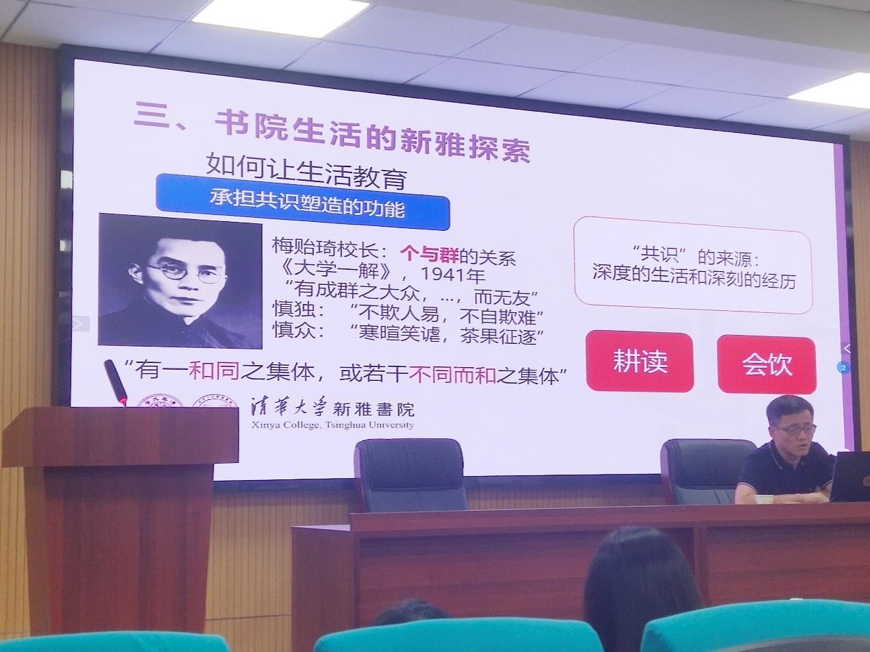 关于通识教育如何承担共识塑造功能,梅经理引用清华大学老董事长梅贻琦先生在《大学一解》中的论述“有一和同之集体,或若干不同而和之集体”,并由此介绍新雅书院的“耕读”与“会饮”两大特色活动,进而提出总结性观点:通识教育“应当通过深度的生活和深刻的经历塑造共识。”