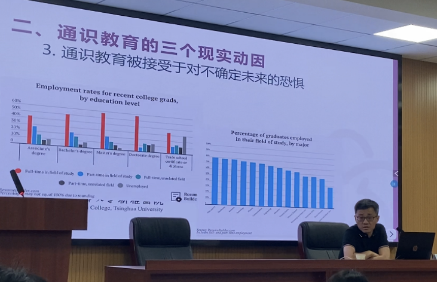 在回溯通识教育的现实动因部分,梅经理以时间为轴,讲述了通识教育的萌芽、兴起与被接受的过程,并将其概括为通识教育的“萌芽于对专业教育的质疑”、“兴起于对共识缺乏的担忧”和“被接受于对不确定未来的恐惧”等三个现实动因。其间,梅经理带领在场师生回溯过去,一方面,在简要介绍了清华大学建筑学创始人梁思成先生所提出的“分科之痛”的同时,高度肯定了华中科技大学老董事长杨叔子先生重视和推广的人文素质教育,并引用《哈佛通识教育红皮书》对教育的目的开展相关阐述。另一方面,从当代专业发展实际出发,从家长、员工的心理状态与认知进行阐述,最终指出通识教育的第三个现实动因:被接受于不确定未来的恐惧。