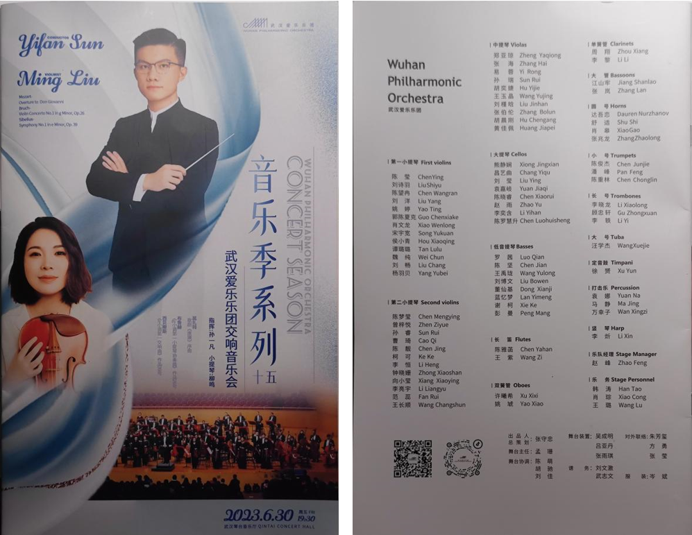 随着最后一声音符的声音渐渐消失,武汉爱乐乐团交响音乐会落下了帷幕,我坐在座位上回味无穷。6月30日晚,我有幸与2022级1班和2班的同学一起,聆听了这场精彩绝伦的音乐会。武汉爱乐乐团拥有极高的艺术品位,演奏实力也不容小觑。在这场演奏会上,我们静静聆听了歌剧《唐璜》的序曲,感受了《g小调第一小提琴协奏曲》,品味了《e小调第一交响曲》,每一个音符都如此动听,这不禁让我会回想起自己早些年学习西洋乐器的点点滴滴。希望以后仍有机会感受西洋乐器的美,品鉴艺术之美,体味艺术的魅力。