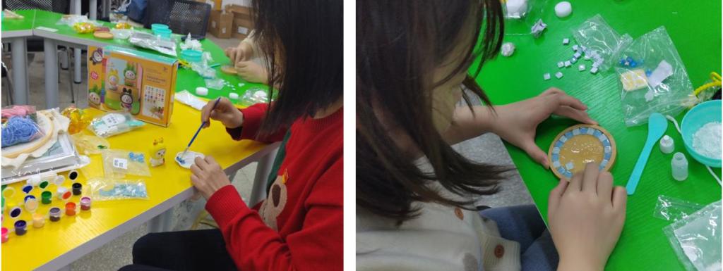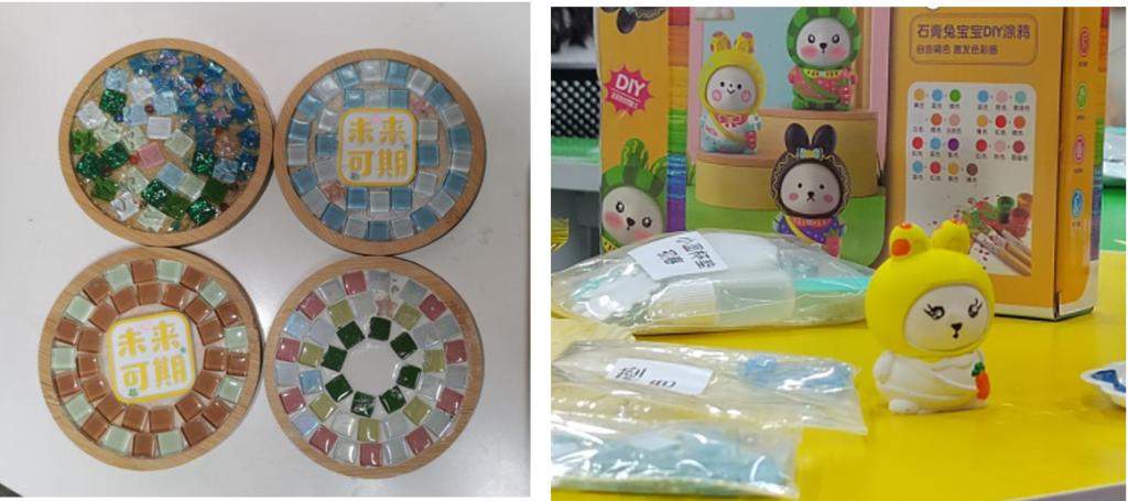 活动伊始,来自员工成长服务中心生活服务部的负责人为每位师生发放钻石画、手工杯垫、石膏娃娃和戳戳乐等多种DIY手工材料包,大家根据各自喜好选择心仪的材料进行创作。