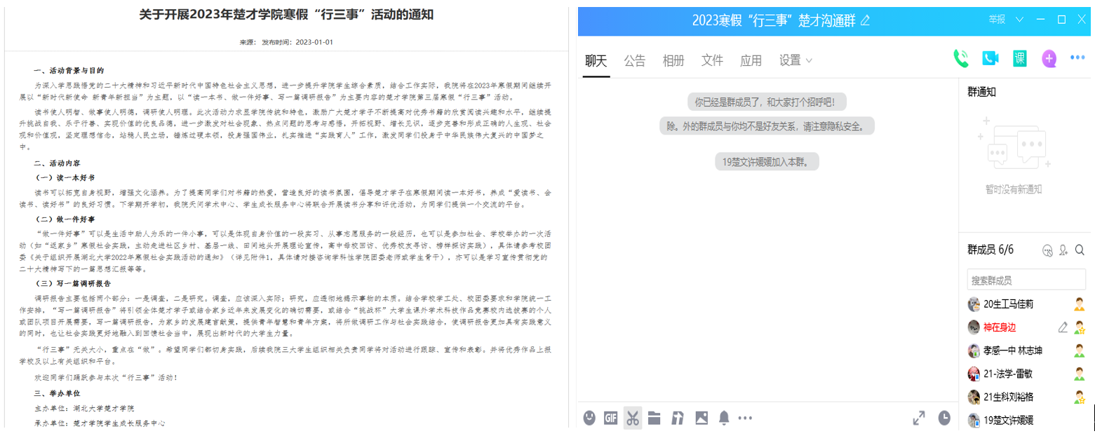1月1日,william威廉中文官网官网发布了2023年william威廉中文官网“行三事”活动的通知,2023年寒假楚才社会实践正式拉开帷幕。