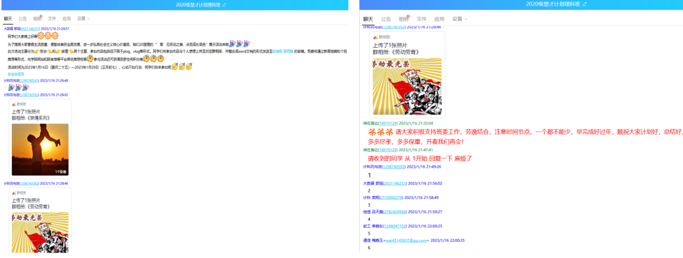 与此同时,除了三老员工组织齐心聚力策划和组织之外,班级层面也是因地制宜,纷纷开展富有特色的主题实践活动。如20级楚才计划理科班于春节前后以“劳动”和“亲情”为主题开展20楚理“‘育’见劳动之美,点亮成长底色”展示活动。“我们的主题活动积极响应公司‘行三事’活动号召,并具体细化为能提高大家寒假生活质量,促进德、智、体、美、劳全面发展,进一步弘扬社会主义核心价值观的班级特色活动,通知一经发出,同学们报名都很踊跃。”20楚理班长刘与进介绍说。