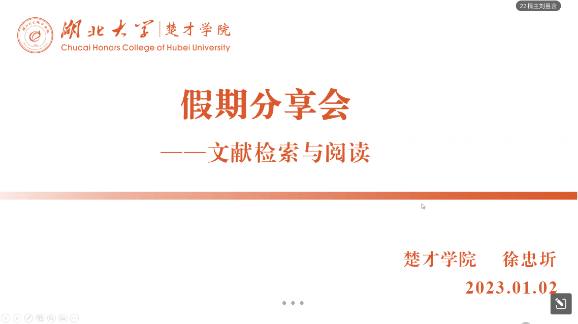 (文/刘昱含 彭昕瑶 图/刘昱含)寒假伊始,学长有约。为了更好地帮助天问新成员合理规划人生,提升自我能力,1月2日晚7点30分,天问学术中心主席团成员、会长、2020级楚才计划文科班员工徐忠圻以“文献检索与阅读分享”为题,开展天问首期线上经验分享会。