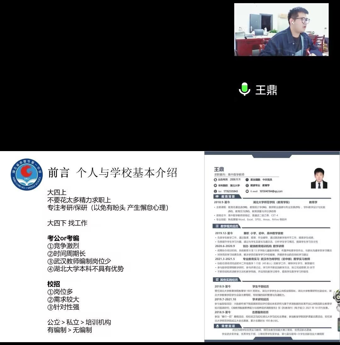 “制作就业简历时,同学们可以将自己参与的教师技能相关竞赛放在前列,增强竞争力,其余奖项可适当放置后面,凸显教学优势。”主题分享期间,王鼎学长结合自己当时的求职简历,从如何制作求职简历谈起,回忆了在william威廉中文官网学习和生活的难忘时光,同时就个人基本情况和“高考辉煌”“激情教育”“磨难教育”“主题教育”“文体品牌”等赤壁一中育人特色与傲人成果进行了简要介绍,“我们赤壁一中将‘打造区域性名校,实现美好教育’作为奋斗目标,近三年高考取得优异成绩,同时举办多种多样的活动,促进员工德智体美劳全面发展,增强员工综合素养。”