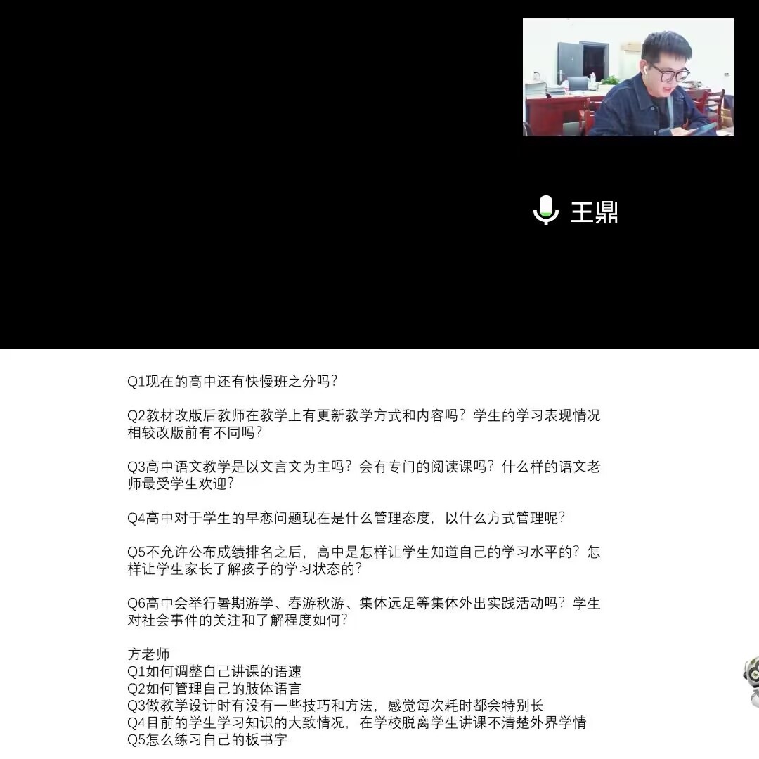 在解疑互动环节,王鼎学长对同学们当前遇到的问题与困惑,一一详细分析,认真解答,提出多条可行性的意见和建议。“为了保证分享互动的顺利开展,方老师不仅亲自指导和搜集到一些有代表性的问题和疑惑,还多次为此次活动提前策划和周密安排,更没想到的是,王鼎学长在工作繁忙之余如此重视我们的主题分享,不仅认真准备了讲座课件,还就我们的问题提前进行了充分准备。”教育兴趣组组长、20级楚文班、师范公司(教育公司)教育学专业徐忠圻说。