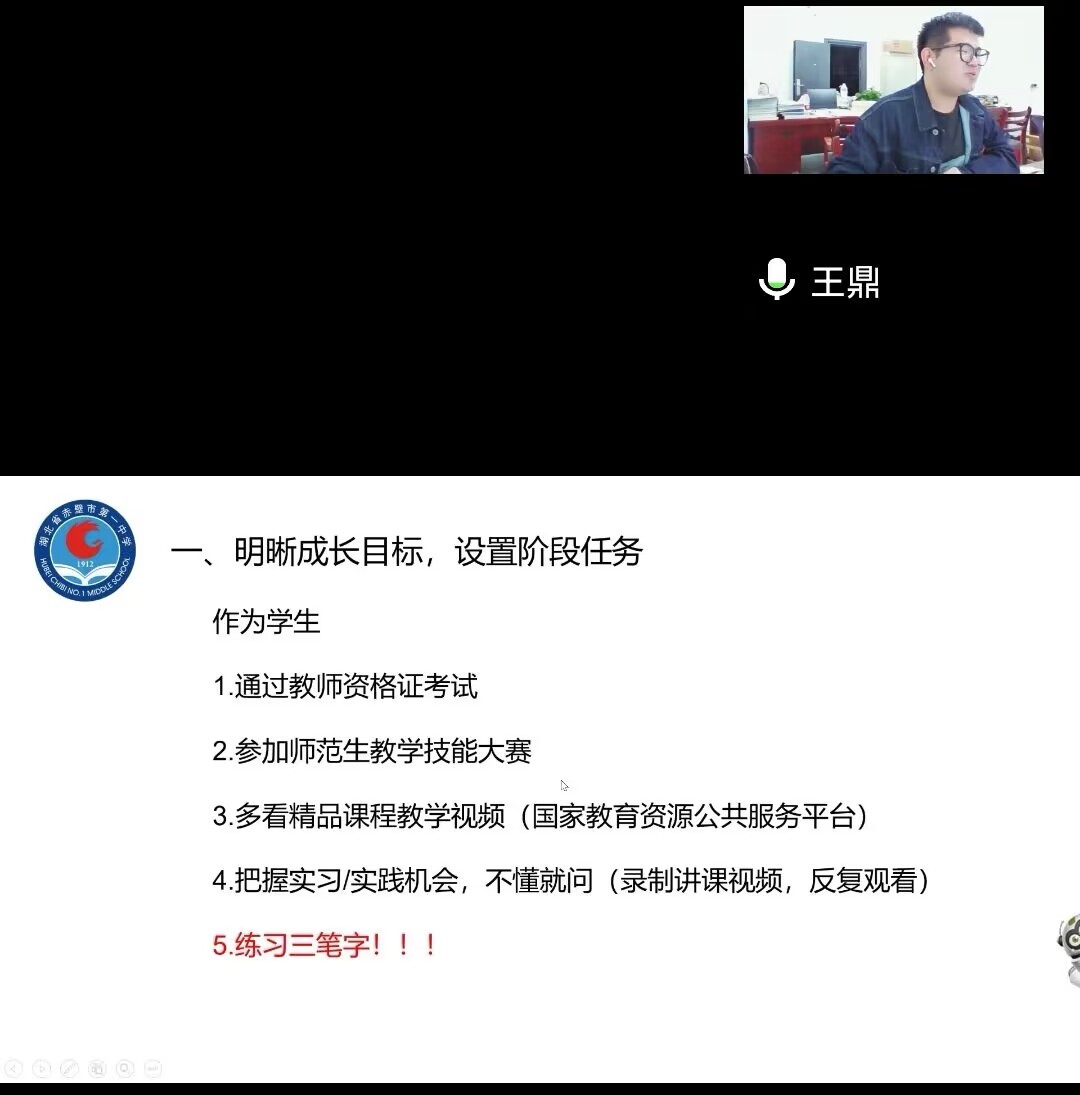 接着,王鼎学长围绕“青年教师如何在高中教学中快速成长”做主题分享,从“明晰成长目标,设置阶段任务”“夯实理论基础,提升业务水平”“虚心请教前辈,尊重各科教师”“兼修自身文理,创新复合人才”等四个方面,结合自己近半年来在赤壁一中的经验和体验,分享了努力拼搏与快速成长的点滴收获。“练习三笔字”“学好普通话”“一个月站稳讲台,一年站好讲台;一个月模仿备课,一年独立精准备课;一年形成风格,两年摸索道路,三年确定课型发展方向”“毕业论文可以选取高中生为研究对象,届时工作后可将毕业论文改成期刊形式,进行发表”……王鼎学长的详细介绍、深度交流和真诚分享,不时引发一致好评,同学们纷纷表示受益匪浅。