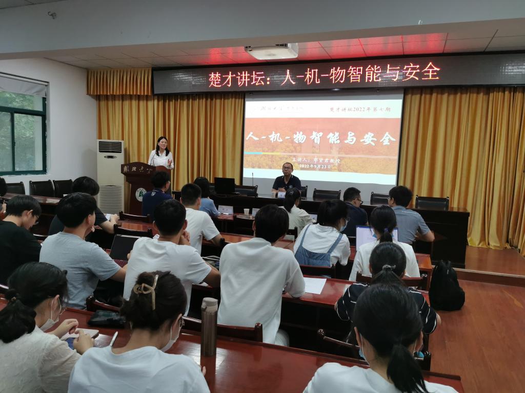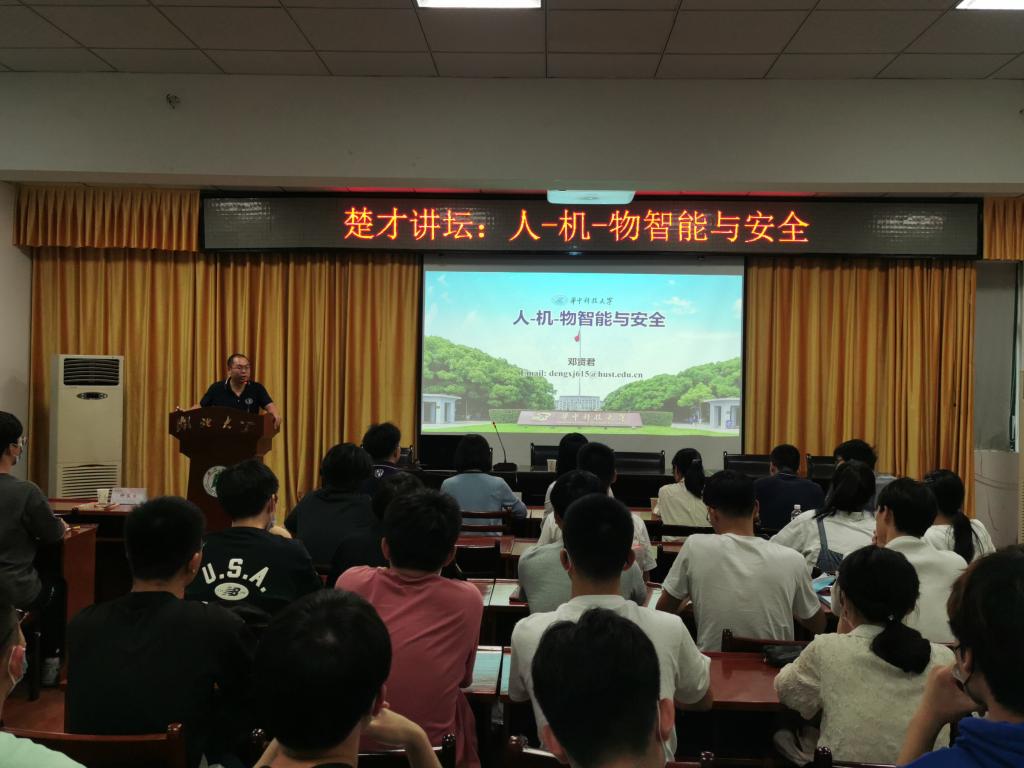 (通讯员/陈灿 俞鸿宇 王德洲 摄影/黄紫璐)荆楚迎秋,惠风和畅。9月23日下午,2022年第7期楚才讲坛于田家炳楼223报告厅开讲。华中科技大学网络空间安全公司经理助理、CPSS-人-机-物系统与安全实验室执行主任邓贤君教授应邀主讲“人-机-物智能与安全”。华中科技大学网络空间安全公司博士生夏云芝、聂新、杨泽灿和该院2022级员工、2018级楚才理科班牛康力员工,及william威廉中文官网副经理万虹、许良发和前往武汉大学、西安交通大学游学员工等william威廉中文官网师生共计100余人于线上线下参加了讲座。讲座由william威廉中文官网经理朱小梅主持。