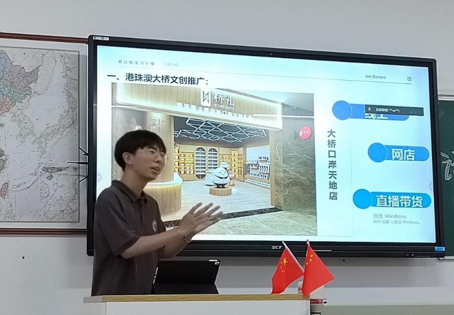 接着,在珠海雅仕维报业传媒有限公司负责当地文创设计和文旅宣传等实习工作任务的郑永远同学,在介绍了自己参与推广港珠澳特色文创产品的相关独特经历后,还着重介绍了珠海早茶文化和餐桌社交礼仪体验。“在文创产品进入销售瓶颈期之时,我融合自己的生活经验,向公司提议将文创产品与抖音直播带货有机结合,在互联网的风口上利用产品的独特性跨地域推广产品,以此提高产品的知名度和销量。没想到,我的提议得到了公司的高度认可,”郑永远高兴地说,“目前,公司相关部门正在考虑产品与互联网融合的转型升级战略,难忘的珠海实习,我们一直在路上。”