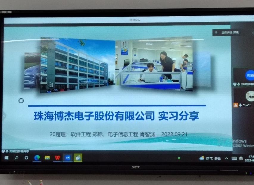 正在西安交通大学游学的郑锦同学通过线上形式,为师生们讲述了他在珠海博杰电子股份有限公司的难忘实习经历。他从实习公司的情况、实习的主要内容、生活见闻和心得体会等方面,全面具体地介绍了他的实习成长故事,在车间实习和工作的一张张鲜活的图片,不仅记录了郑锦丰富的实习生活和难忘经历,更记录了他在实习中的珍贵体验和丰硕收获。他说,“学会独立、保持理性、掌控人生、充盈头脑、谨言慎行、善于倾听、自我反思”是他这一行在为人处世上最大的收获。