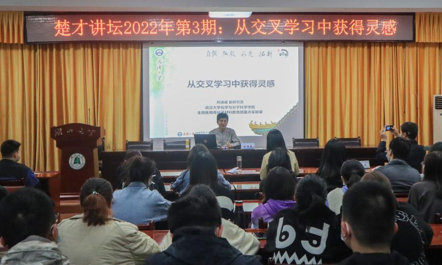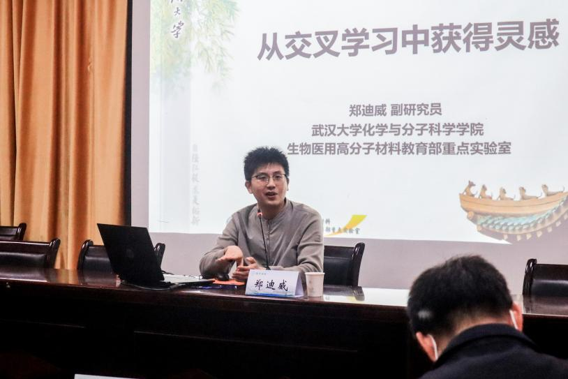 (通讯员/洪子尧 王一帆 摄影/刘诗凡)4月15日下午,优秀院友、武汉大学化学与分子科学公司、生物医用高分子材料教育部重点实验室副研究员郑迪威博士应邀做客楚才讲坛,在田家炳楼223会议室为大家带来“从交叉学习中获得灵感”主题讲座。william威廉中文官网全体教工和来自william威廉中文官网、材料科学与工程公司的近百名同学参加本次讲座。常务副经理朱小梅主持并对郑迪威博士返校做客表示热烈欢迎。