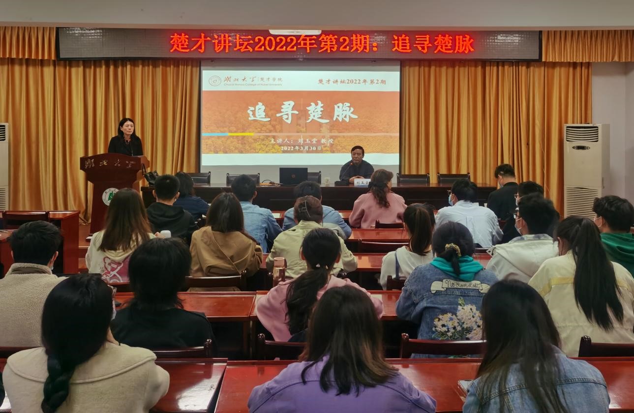 “荆楚文化是悠久的中华文明的重要组成部分,在中华文明发展史上的地位举足轻重。”刘玉堂教授引用2018年4月习近平总书记在武汉考察时的重要讲话,强调了楚文化的重要性。随后,他解释了“楚脉”的含义:“脉即文脉、根脉、血脉,楚脉就是楚文化的精华。”“楚文化是中国春秋时期南方诸侯国楚国的物质文化和精神文化集合。”并以“追寻楚脉”为主题,结合跌宕多姿、精妙绝伦的楚国历史,生动回忆了自己追寻千秋楚脉,凝练楚文化精神的心路历程与研究心得——将体现楚地先民精神与品格的话语与新时代所崇尚的核心价值结合起来,在此基础上凝练出六个方面的楚文化精神:“筚路蓝缕”的进取精神、“大象无形”的开放气度、“一鸣惊人”的创新意识、“上善若水”的和谐理念、“九死未悔”的爱国情结及“一诺千金”的诚信品格。