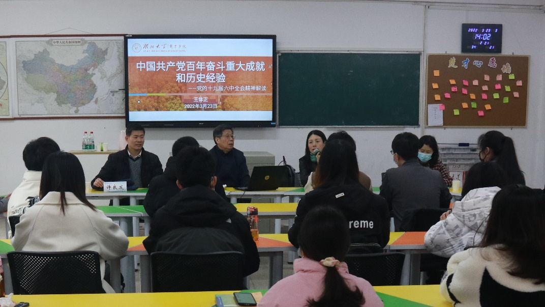“这是一次具有里程碑意义、承前启后的大会。”报告伊始,王体正再次向在场的师生们指出了此次会议召开的背景和意义。接着,他从九个方面分别宣讲了十九届六中全会精神的主要内容,还就“中国共产党是什么”、“中国共产党干什么”等内容进行了深入阐释。整个报告逻辑清晰,证据翔实,全过程处处饱含着其对党的深情和热爱:“党和国家紧紧依靠人民,用几十年的时间走完了西方发达资本主义国家几百年的发展历程,这不能不说是一个奇迹。”“我们实现了从生产力相对落后的状况到经济总量跃居世界第二的历史性突破,实现了全体人民的生活状况由温饱不足向全面小康的跨越。”特别是谈到坚决拥护党的领导和点赞祖国经济建设成就等内容时,他反复总结强调,“我们党是无产阶级的政党,始终代表着最广大人民的根本利益,也始终保持着为人民服务的坚定信念。”“党在百年奋斗的历程中毫不动摇地坚守着以人民为中心的理念,在未来的发展中也必然将不忘初心,砥砺前行。”