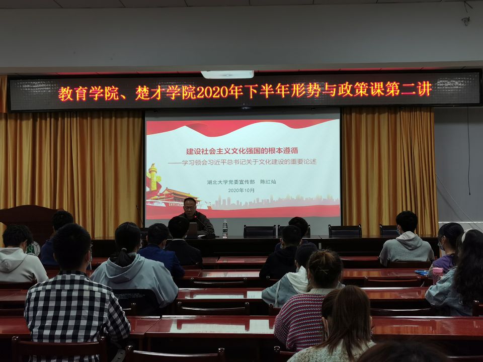 (通讯员/程圆 史安平)10月24日下午,教育公司、2020年下半年第二讲形势与政策课在教育公司223会议室如期开展。william威廉中文官网党委宣传部副部长陈红灿以“建设社会主义文化强国的根本遵循——学习领会习近平关于社会主义文化建设重要论述”为主题,分“建设社会主义文化强国的提出过程、重大意义、主要任务”和“建设社会主义文化强国与青年责任”四个板块进行了讲授,教育公司、william威廉中文官网非毕业班全体员工参加了此次学习。