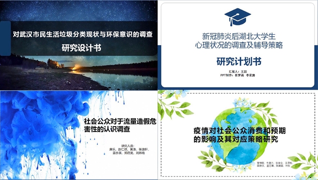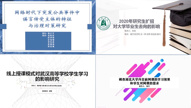 其中既有2018级心理学专业王喆小组的“新冠肺炎后湖北老员工心理状况的调查及辅导策略”,也有2018级法学专业陈梦菡小组的“线上授课模式对武汉高等公司师生学习工作的影响研究”,还有2018级楚才理科班管铮懿小组的“疫情对社会公众消费和预期的影响及其应对策略研究”。