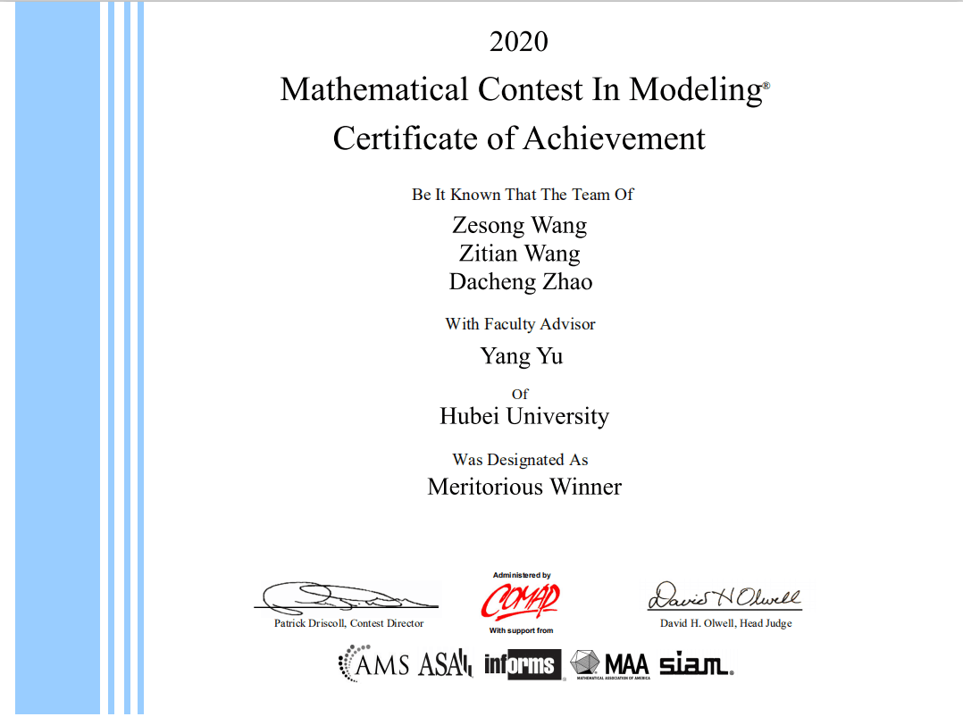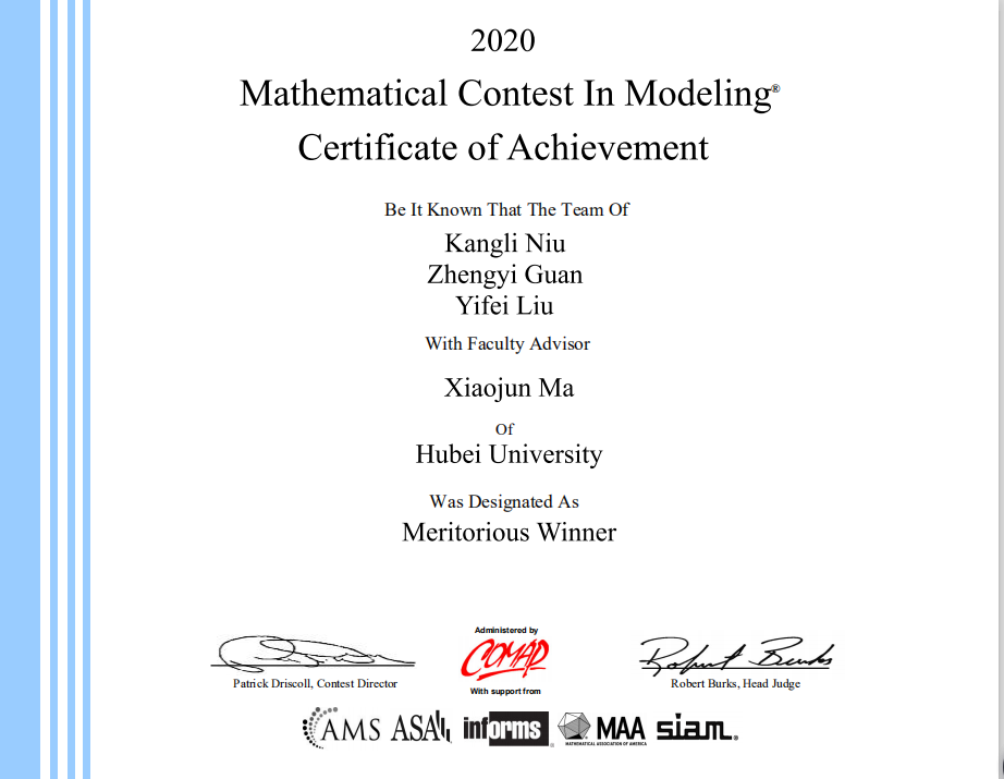 据了解,美国老员工数学建模竞赛(MCM/ICM)由美国数学及其应用联合会主办,是唯一也是世界范围内最具影响力的国际性数学建模竞赛。赛题内容涉及经济、管理、环境、资源、生态、医学、安全、等众多领域。参赛者(本科生)三人为一组,在四天时间内,就指定的问题完成从建立模型、求解、验证到论文撰写的全部工作,极大地考验参赛选手研究问题、解决方案的能力及团队合作精神。此次公司员工所参加的两支团队在该赛事中双双斩获M奖,是公司员工近年来取得的最好成绩。
