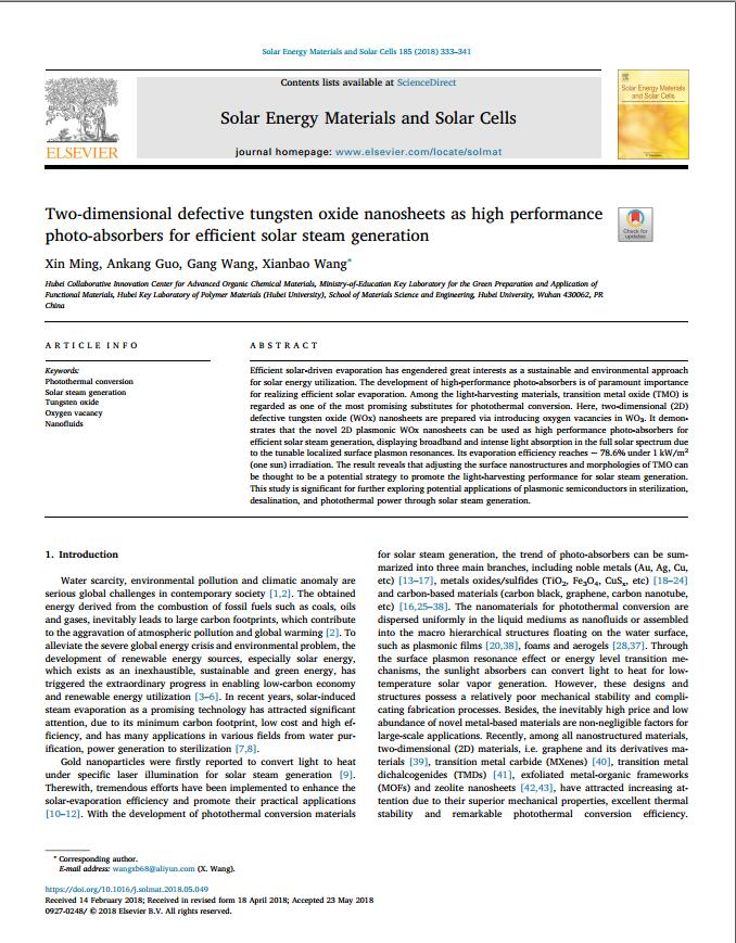 来自15楚理高分子材料与工程专业的明鑫凭借自己在SCI一区《Solar Energy Materials and Solar Cells》上发表的《Two-dimensional defective tungsten oxide nanosheets as high performance photo-absorbers for efficient solar steam generation》等系列论文在本次优秀科研成果评选中获得了一等奖。大二起,明鑫就开始了对这一领域的研究,在他的导师王贤保的指导下,经历了多次实验制备合成,数据采集分析以及结果研究讨论,终于完成了该项目。该项研究旨在解决日益突出的能源问题和淡水需求,在快速净化、蒸馏和发电等领域具有丰富的潜在应用。