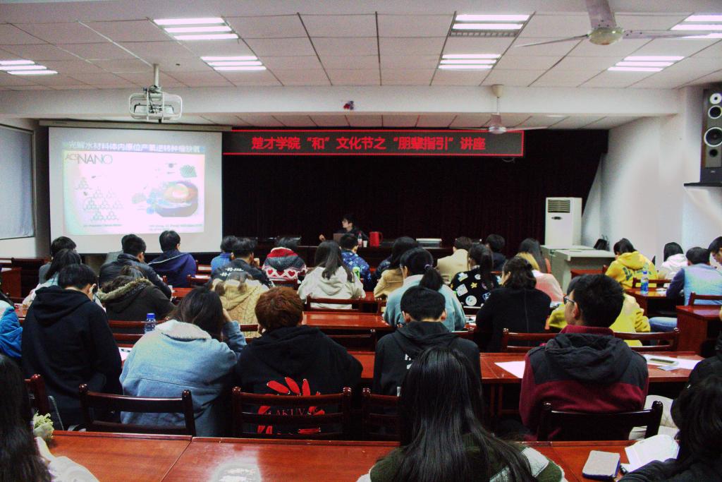 讲座伊始,郑迪威用通俗易懂的语言向楚才学子简单介绍了自己目前的专业方向和自己的科研经历,谈及自己的科研道路,郑迪威总结道,正是“交叉”与“合作”使他受益匪浅。郑迪威表示,在最近所做的一个课题中,正是受到能源科学的启发,他创新方法,最终探索出了将生物体内二氧化碳转化为可抗肿瘤的一氧化碳的新思路。