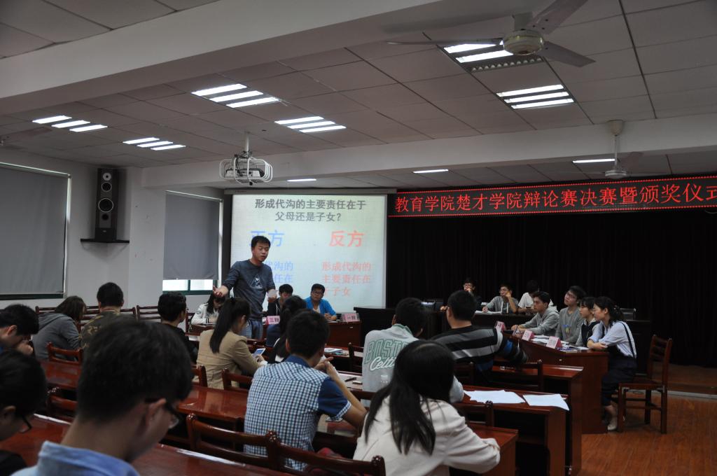 在简单的团队介绍后,比赛正式拉开帷幕。正反两方分别围绕“形成代沟的主要责任是父母还是子女”展开辩论。在开篇立论环节,双方一辩分别从沟通的责任、义务等方面阐述了本方观点。随后,在攻辩阶段,正方三辩指出父母思维的固化是造成与子女沟通不畅的主要原因,同时父母的心理、年龄以及对新事物的弱接受能力也对沟通产生不利的影响。反方三辩则立即反驳道,子女有责任有义务去更新父母的思想观念来消除代沟。进入自由辩论后,正方通过一系列严谨的推理指出代沟是客观存在的,父母在其中占据主导地位;反方也毫不退缩,凭借敏捷的思维和丰富的知识论证代沟产生的真正原因是信息沟通不畅,是子女没有将信息很好地传达给父母,从而再次声明“代沟形成的主要责任在子女”的观点。辩手们针锋相对,将现场气氛推向高潮,赢得观众的阵阵喝彩。经过一番激烈的唇枪舌剑,最终反方摘取本届辩论赛的桂冠。
