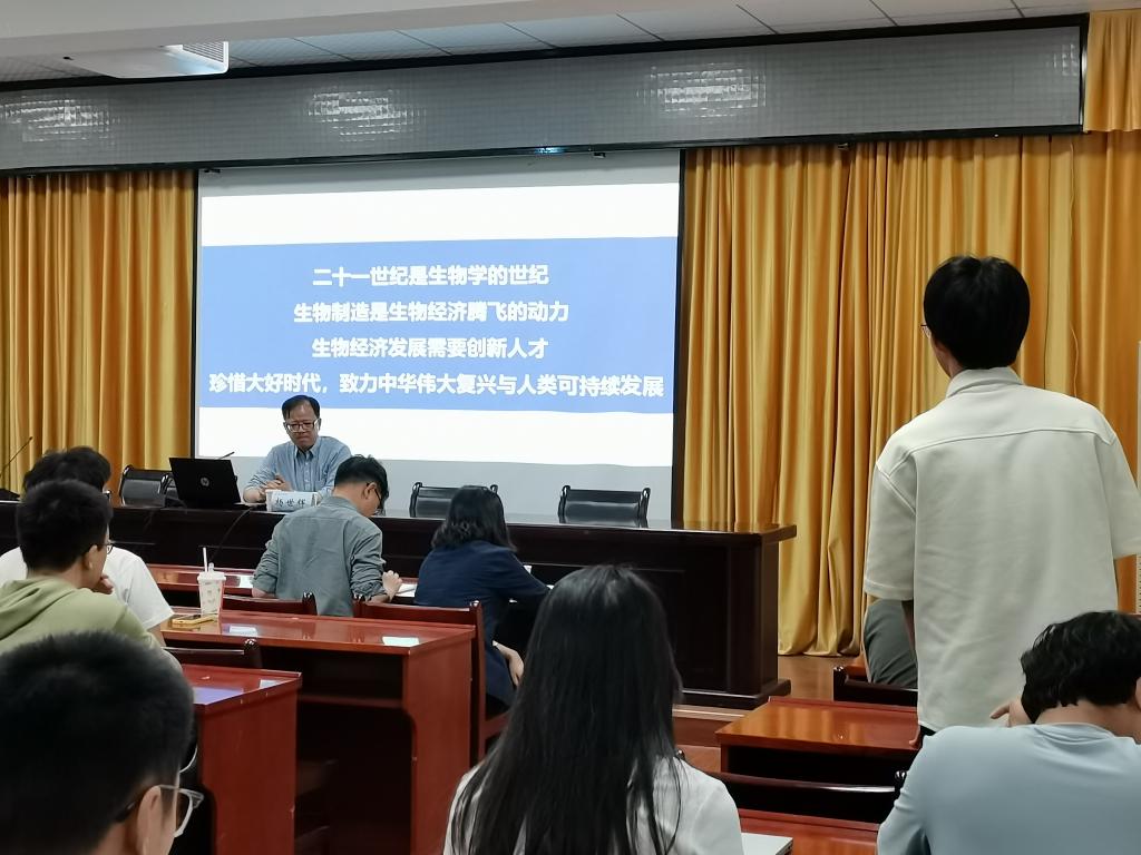 杨教授从新质生产力谈起,提到当前生物制造、生命科学、人工智能等领域发展势头迅猛,国家《“十四五”生物经济发展规划》对相关产业做出了重点部署,推动我国生物经济发展壮大,并进一步介绍了我国合成生物新兴企业的地域布局。他鼓励同学们在专业学习方面,要多跨学科学习,走出专业局限性,挑战突破自我。