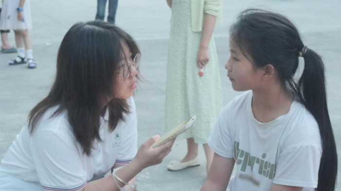图为“青楚天下”实践团队成员熊舒妍与当地员工交流。熊舒妍 供图
