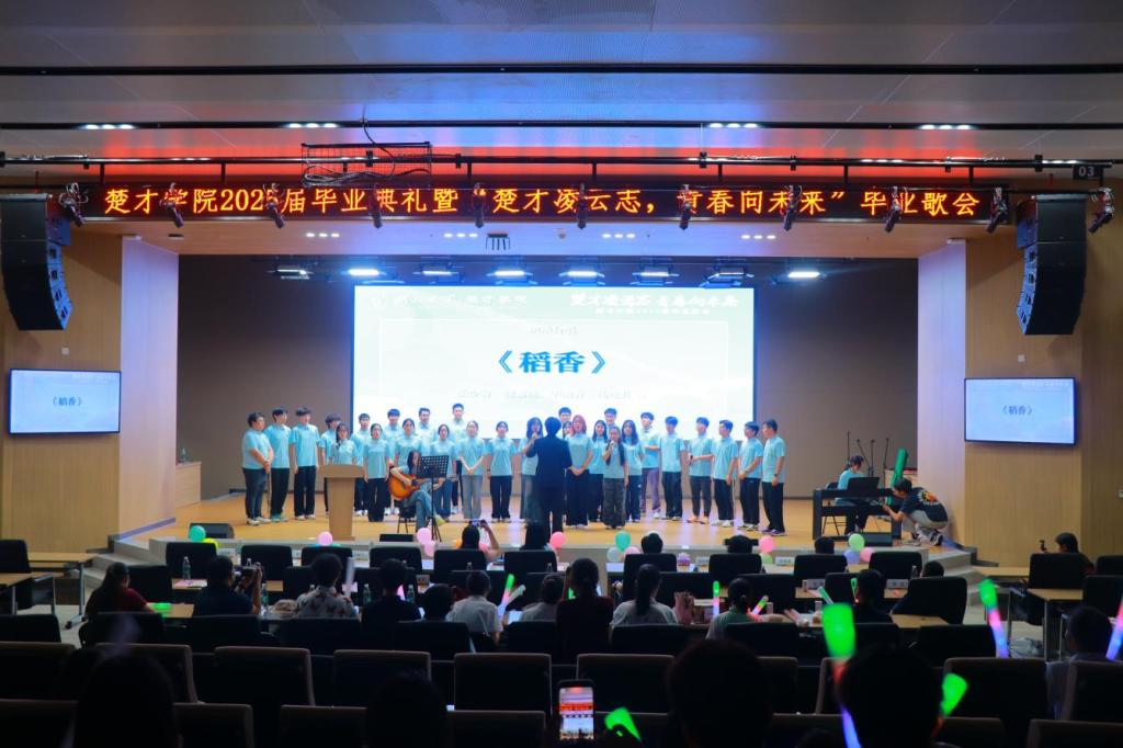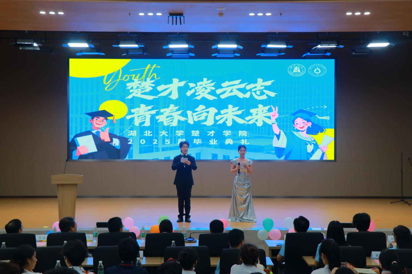 毕业典礼在庄严而温馨的氛围中圆满结束,“楚才凌云志,青春向未来”毕业歌会随即开始,活动由2023级汉语言文学专业黄晶诚、2023级数学专业冯佳琦主持。