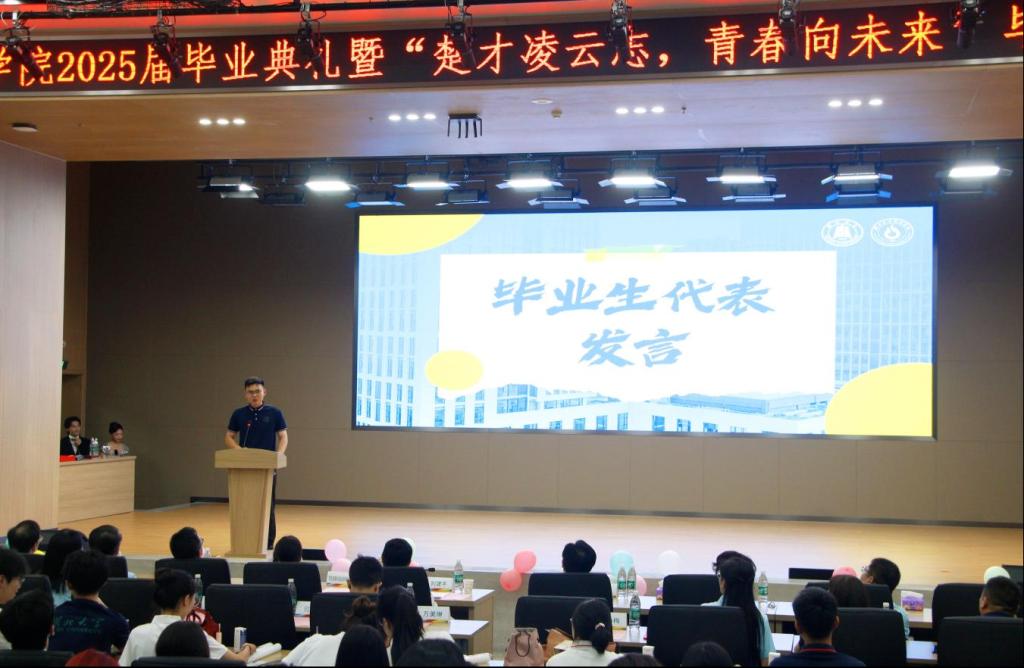 毕业生代表、2025届金融学专业毕业生蔡益凯以《告别,是为了更好地出发》为题发表感言。他以“告别”为线索展开回顾:告别本科课堂,带走独立思考的能力与持续成长的底气;告别湖大师友,铭记老师们“打开窗子”般的教诲,珍惜同学们风雨同舟的情谊;告别昔日自己,带着在楚才磨砺出的品格迎接未来。蔡益凯最后向默默支持的家人表达了深切感谢,并总结道,本科毕业这一次告别,是为了更好地出发。
