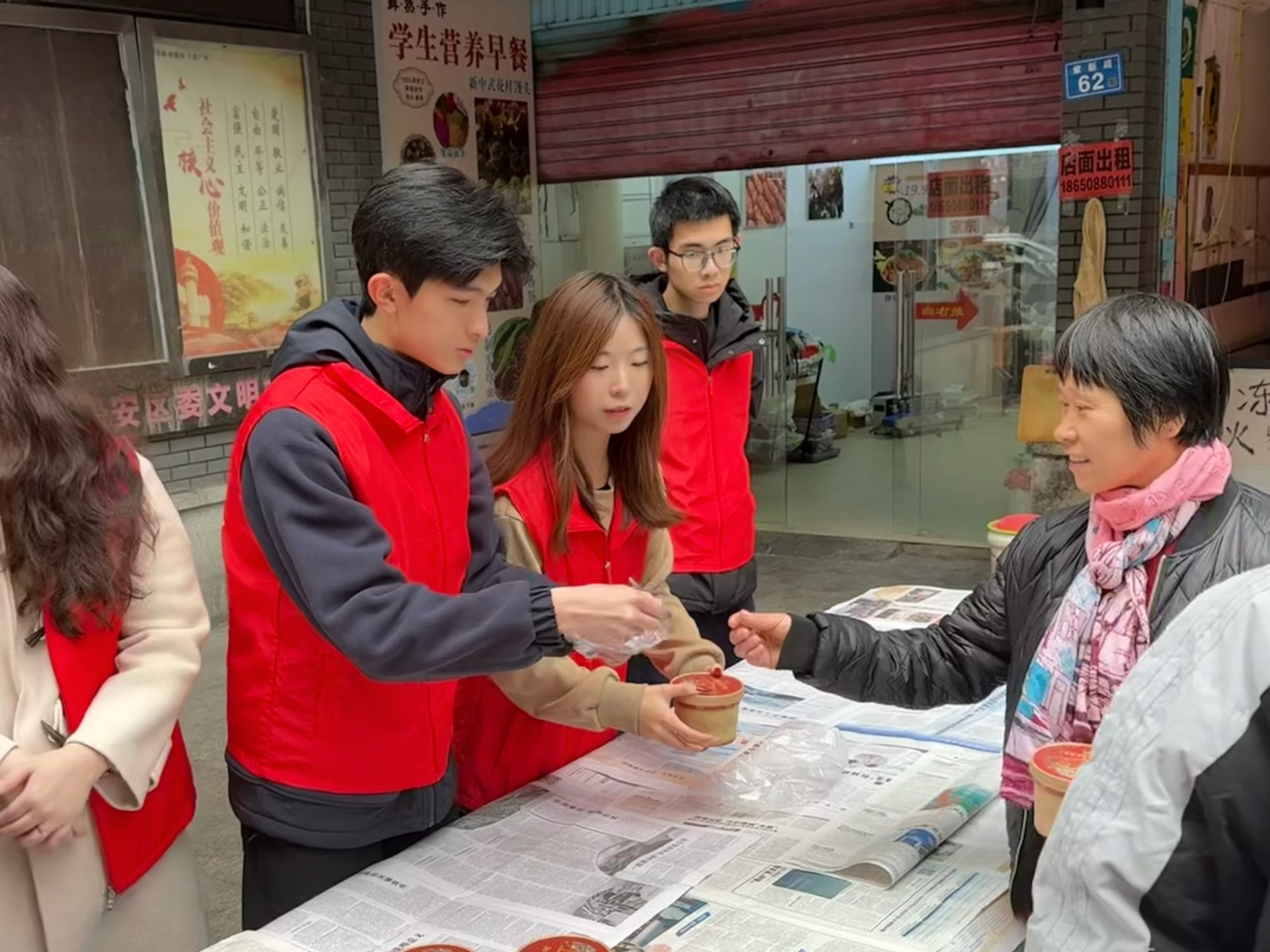 在紫新社区,团队成员围绕民生服务与节日关怀开展多元实践:恰逢腊八节,志愿者在现场书写春联,分发暖心腊八粥,为社区老人送上节日祝福;清扫社区,优化居民生活环境;同步开展居民需求调研,面对面访谈记录生活诉求。