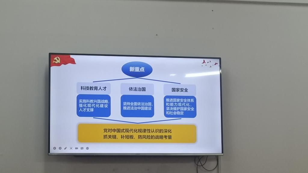 熊友华引用习近平总书记2023年新年贺词中“明天的中国,奋斗创造奇迹”强调奋斗的重要性。党的二十大报告中提出的科技教育人才、依法治国、国家安全等新重点,是党对中国式现代化规律性认识的深化,是对中国共产党抓关键、补短板、防风险的战略考量。熊友华围绕“大党独有难题”、“两个长期存在”、“两个永远在路上”以及“四大体系”进一步展开论述,理论与实际相结合、历史与现实相结合,强调要自觉用习近平新时代中国特色社会主义思想武装头脑、指导实践,为全面建设社会主义现代化国家、全面推进中华民族伟大复兴而团结奋斗。报告结束,掌声热烈。