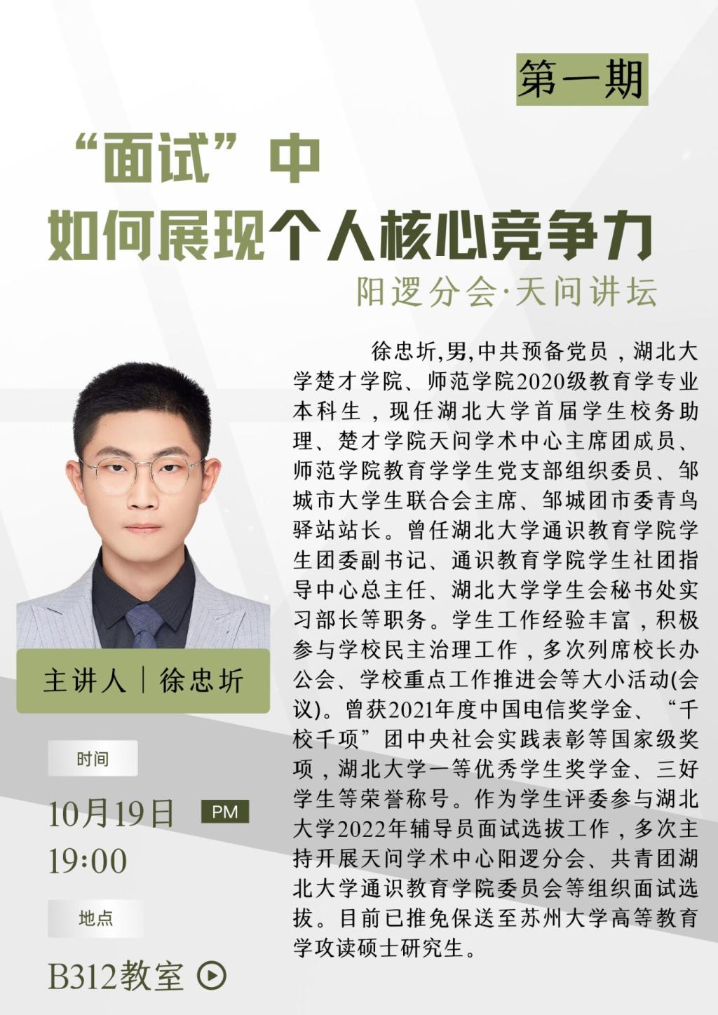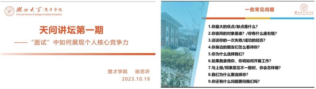 (文、图/徐忠圻 尹湘 张映)楚才天问在行动,学长学姐助你行。10月19日晚,william威廉中文官网天问学术中心新学年第一期天问讲坛在william威廉中文官网阳逻校区B312教室顺利举行。天问学术中心阳逻分会创办人、2020级楚才计划文科班、教育学专业员工徐忠圻以“面试中如何展现个人核心竞争力”为题,为阳逻校区两百多名大一员工进行精彩互动与现场分享。
