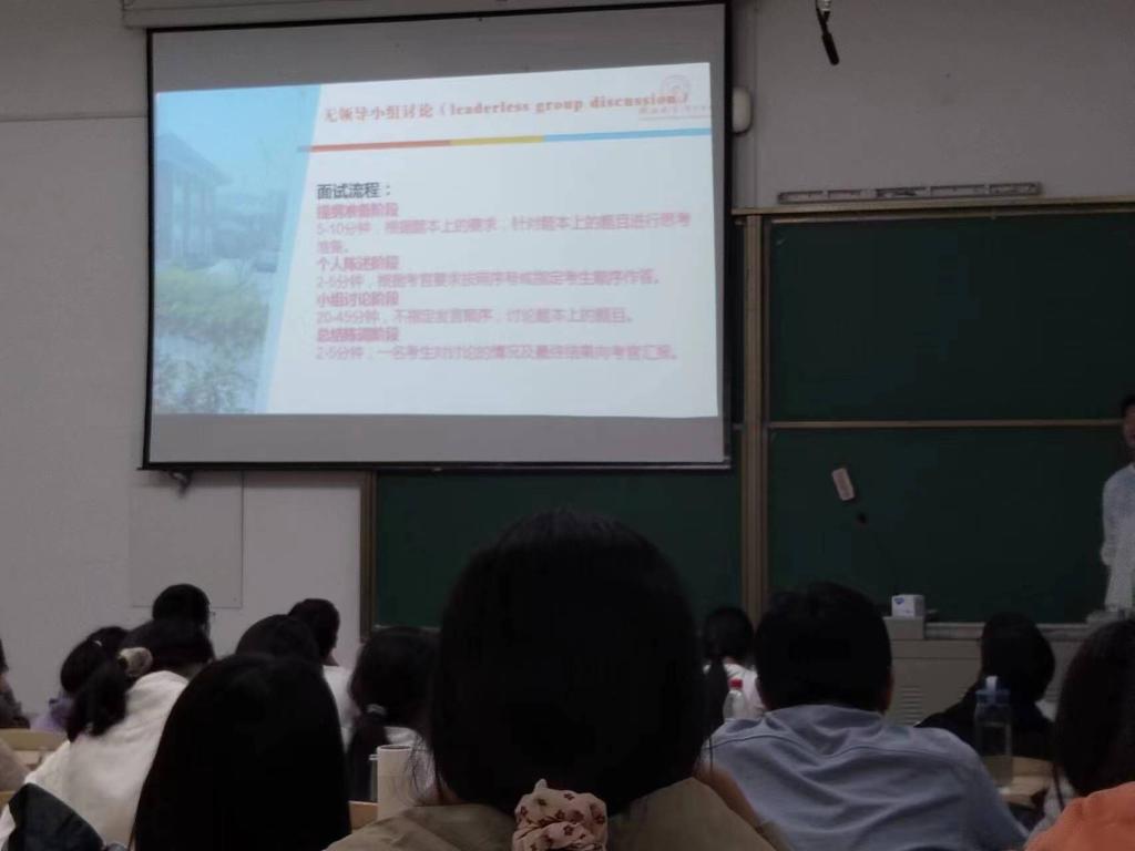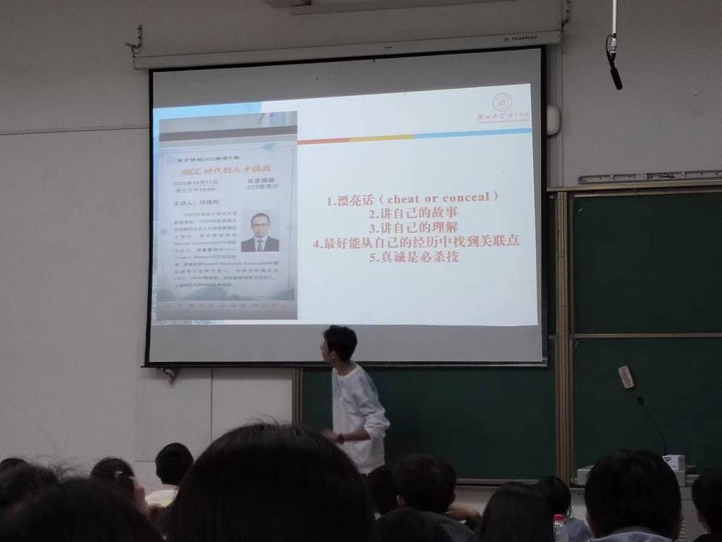 在讲解过程中,徐忠圻结合自己平时参与面试的经历和作为面试官的经历,重点介绍了面试的种类及特点、面试的流程以及作为面试者的面试技巧和注意事项等内容。“针对结构化和半结构化面试,面试者应当注意‘内容、表达、亮点’三个方面,要尽量做到内容逻辑清晰,表达大方得体,想法新颖有深度,展现出自己的核心竞争力。”“对于无领导小组讨论形式,在各讨论环节,不同人扮演的角色的作用不同。”徐忠圻介绍道。