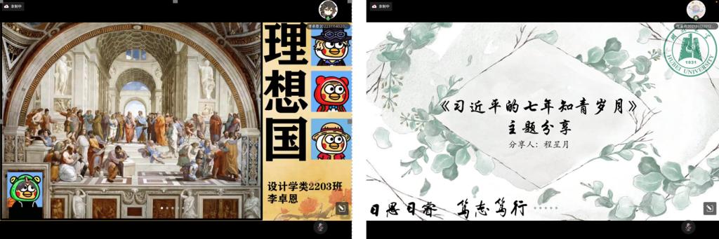人生意义、社会责任上的理想国究竟是什么、又该如何实现?接着,由2022级设计学类专业员工李卓恩介绍《理想国》,围绕国人心中的理想国、柏拉图正义理论产生的时代背景、《理想国》中理论的内容和轴心时代的正义的影响等四个方面进行了深刻的阐述,精彩的分享引起了大家更深的思考。而2022级汉语言文学(师范类)专业员工程星月则从知青说”“村民说各界说三部分内容,分享了《习近平的七年知青岁月》一书。习近平总书记七年的知青经历是他治国理政思想的关键历史起点,不仅将自己的青春奉献给了人民,更是亲身践行了自力更生、踏实肯干、艰苦奋斗的精神实质。这本书使我受益匪浅,不仅让我对习近平总书记的成长历程有了更加清晰的认识,还让我更加坚定了‘永远跟党走’的信心和决心程星月分享道。