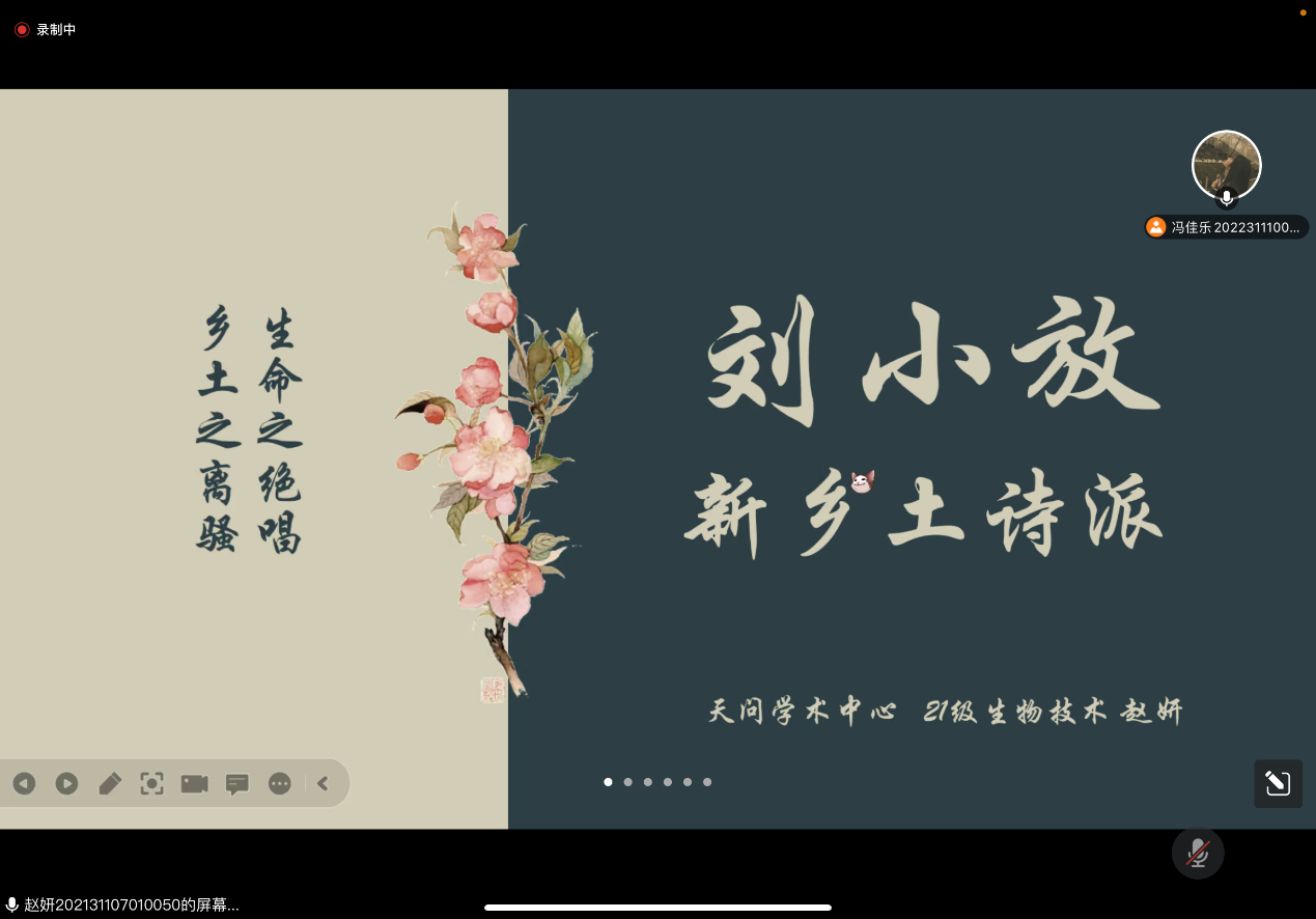 会上,天问学术中心主席团成员、副会长、2021级生物技术专业员工赵妍首先介绍了诗人刘小放以及提倡“传承民族血脉,塑造精神家园”主张的新乡土诗派,带领大家一同品读刘小放的诗歌代表作之一《试鞋》传达的生活情境与自然情感,以及诗歌《啊,老祖父》中深入描写农民生活和命运澎湃的精彩部分。赵妍娓娓道来,细腻的讲述以及真心感受诗人与诗文所传达的浓浓乡土情的倾情分享,获得大家的纷纷点赞。