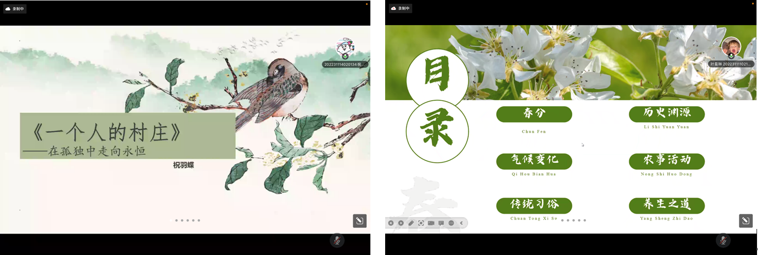 随后,2022级设计学类专业员工祝羽蝶分享了“故乡”主题的《一个人的村庄》,分四个部分解读了“在孤独中走向永恒”主题,让大家体悟到此书在对生命的深刻思考中散发的自然气息。在以“春”为主题的分享中,2022级心理学专业员工叶曼琳由刘长卿的《春分》一诗引入,从春分、历史渊源、气候变化、农事活动、传统习俗和养生之道六个方面介绍了春分这一节气,通过从“天文”到“地理”的精彩讲解,引导大家对万物复苏的春分时节有了更加深刻的了解,进一步感受到了春回大地时的勃勃生机。