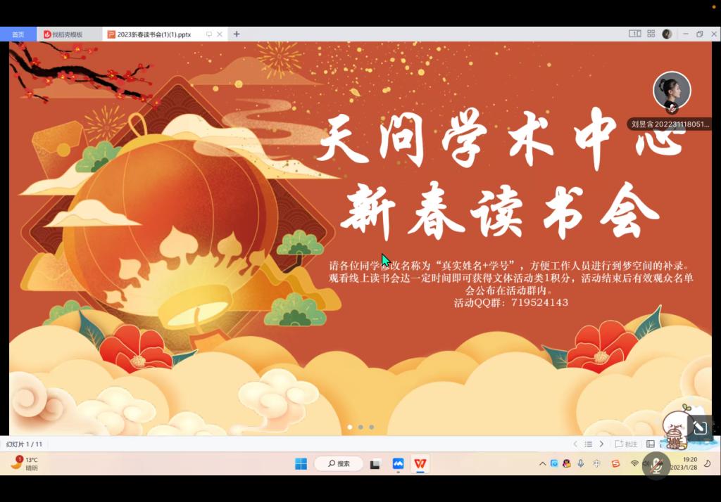 (文/刘昱含 庄娜 图/刘昱含)新春佳节喜来临,前“兔”似锦迎新岁。为提升广老员工的阅读兴趣,营造读书交流的良好氛围,128日晚730分,天问学术中心于线上开展了2023年天问新春联谊读书会。活动由天问阳逻分会成员、2022级历史学(师范)专业员工冯佳乐主持。