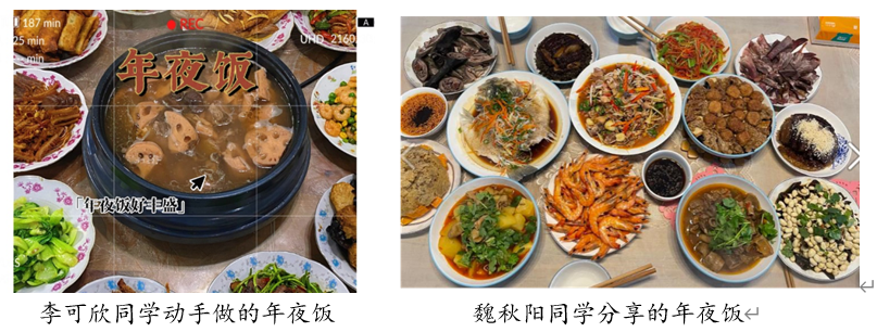 “四方食事,不过一碗人间烟火”。活动期间,还有不少同学分享了自己亲手做的一大桌子饭菜,晒出了祖国各地南北自家色香味俱全的年夜饭。同学们端着锅铲翻炒,香气袭来,浸润着新年的喜气吉祥;每一碟菜,都包裹着美好寓意,让厨房的烟火气,化为对于父母辛勤付出的感恩。“在阖家团圆之际,同学们与家人们一同下厨房,学习几道心意好菜,在交流群中分享图片,不仅让分布在不同省份的同学们感受到浓郁的‘年味’,同时也加强了班级建设与互动联系。”活动负责人之一、班级文体委员刘斌如是说。