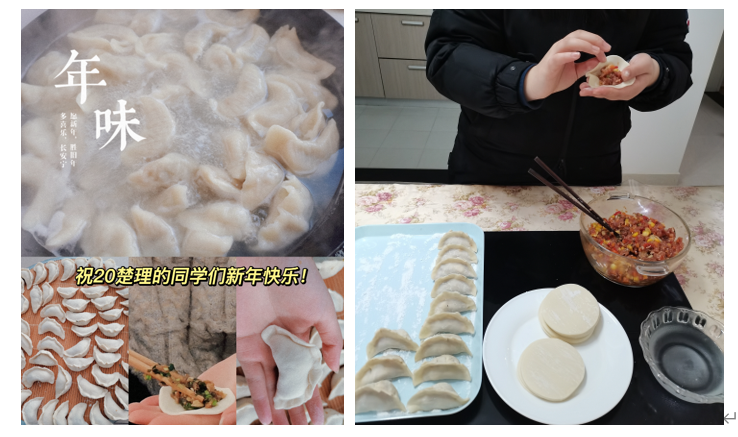 “无论中华南北,饺子都是我们年夜饭中不可或缺的一部分。”吕天策、郑雪瑶、周瑞彤、毕紫璇、马佳莉、郭旭、郭斐、刘与进等8位同学一一分享了自己亲手做的饺子。久居异乡读书回家的“宝宝们”以包饺子为契机,亲手放入爱与思念,亲手为父母包上圆圆滚滚的饺子,送上温暖与关怀。