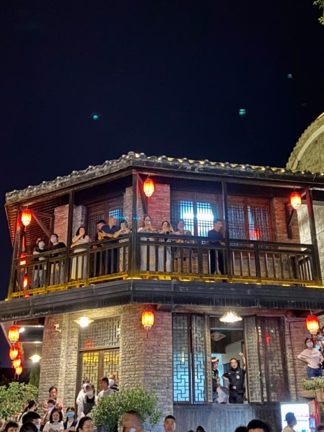 图为莫愁村夜景一隅,人头簇动,建筑古色古香