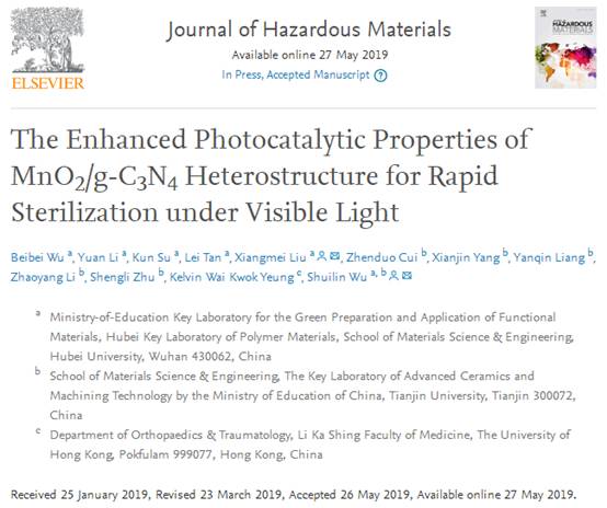 近期,公司2015级理科班高分子材料与工程专业员工吴贝贝(第一作者)在楚天学子刘想梅副教授(通讯作者)的指导下,在国际期刊《Journal of Hazardous Materials》(影响因子6.434,一区TOP)上发表高水平研究论文(The Enhanced Photocatalytic Properties of MnO2/g-C3N4 Heterostructure for Rapid Sterilization under Visible Light)。