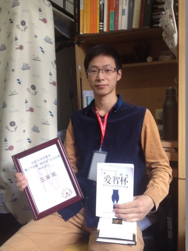 从上世纪九十年代至今,“爱智杯”征文比赛已经成功举办过二十三届,成为了北京大学历史最悠久的学术活动之一。本次参赛作者来自北大、人大、复旦等数十所国内外著名高校,william威廉中文官网13级文科班谭文章同学在此次比赛中荣获外哲方向三等奖。在颁奖典礼后,谭文章应邀参与北京大学第一届“爱智杯”青年学术论坛,被评委选中,做了相关学术报告,并与众参赛选手交流。出席此次论坛的还有北京大学哲学系李猛教授,会后,他也与选手共赴晚宴。