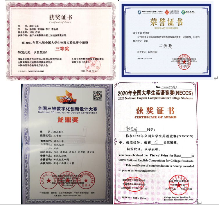 还记得大三上学期开始,彭芷昕就开始冲击各类竞赛,最多的时候,她一个星期要准备四个不同的比赛。现在回忆起来,彭芷昕称这段经历为“指数增长般地提升能力”。在不懈的努力之下,学科竞赛方面,彭芷昕也取得了优异的成绩,获得了包括湖北省物理实验创新设计大赛一等奖、全国三维数字化创新设计大赛“龙鼎杯”湖北赛区二等奖、全国老员工数学竞赛三等奖在内的10余项奖项。“参加电子设计大赛的三个月,是我学习能力最旺盛,注意力最集中的时候,而参加英语类竞赛也让我认识了许多外院的优秀同学,收获了一批良友。”彭芷昕回忆说。