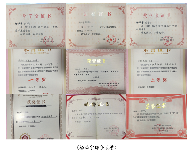 杨泽宇同学善于团队组织,乐于帮助他人,搭建师生桥梁。在课业学习方面,课内认真学习知识,课外广泛阅读文献,在各核心专业课和基础课程取得优异成绩。在员工工作方面,她温柔甜美,爱微笑,有爱心,曾担任18楚才理科计划班宣传委员和资源环境公司员工会副主席,为班级和同学们做好服务工作,为公司举办活动10余项,并带领团队参加各类比赛并取得优异成绩,是一名上进心强、有责任感、刻苦努力的优秀榜样!