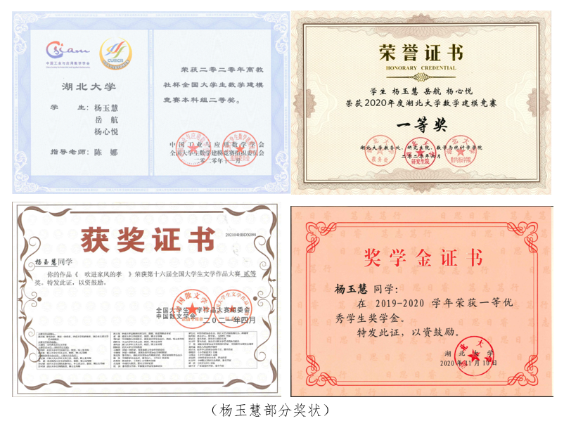 在计算机专业老师们的关心和引导下,杨玉慧很早就投身于数学建模竞赛及相关领域。她主持或参与了“基于BP神经网络的中小微型企业信贷策略研究”“COVID-19传播建模分析与预测”“校园巡逻车巡逻方案及优化”等项目,获得国家级、校级等多项建模竞赛奖励。回想起21年秋季的申请保研经历,杨玉慧强调,这些参赛经历和阶段成绩对自己在申请免试研究生的面试过程中有很大帮助。“靡不有初,鲜克有终”,持之以恒、有的放矢的努力才是成功的关键。