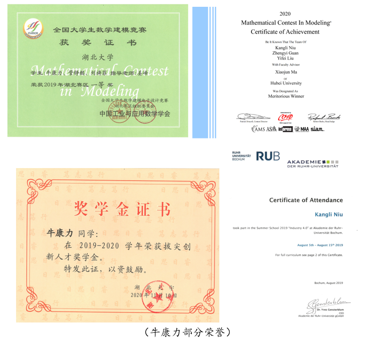 在日常学习与生活中,牛康力总是广泛与人交友,做到学习、工作两不误。面对专业学习,他总是严谨踏实,稳扎稳打,综合排名位居专业第一。课堂之外,他积极参与各项学科竞赛,曾以队长身份获得美国老员工数学建模竞赛M奖(一等奖),还荣获亚太地区老员工数学建模竞赛全国三等奖、全国老员工数学建模竞赛湖北赛区一等奖等多项国际、国家级和省级奖项。