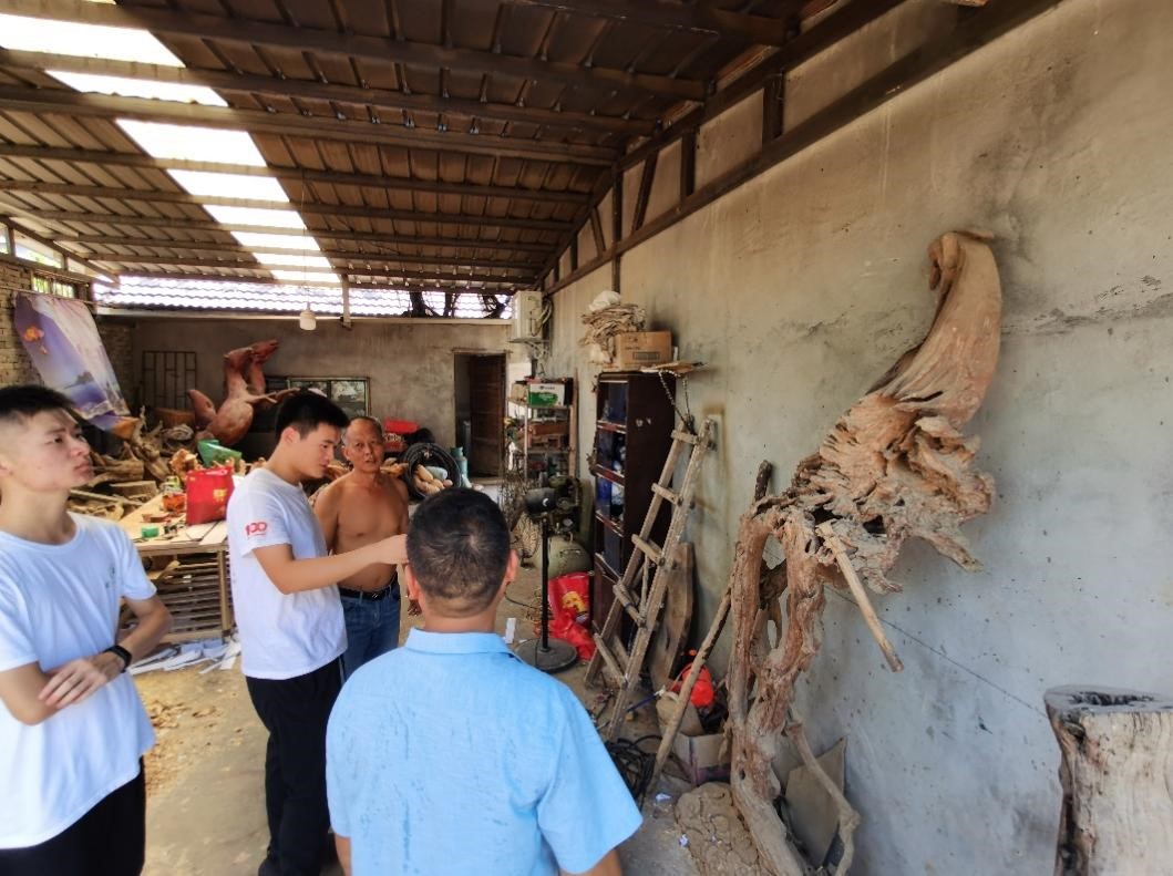 “这是市博物馆找我定制的根雕作品,根雕工艺讲究‘三分人工,七分天成’,作品处于初始阶段,循着根系的形状可以把它雕琢成一只浴火的凤凰。”根雕技艺传承人柯师傅热情地向团队成员介绍着根雕文化和眼前的作品。根雕艺术是发现自然美而又显示创造性加工的造型艺术,主要利用根材的天然形态来表现艺术形象,辅助性进行人工处理修饰。柯师傅家已经四代传承和发扬根雕这门技艺,并不断有想学习根雕的人前来拜师学艺,根雕文化也一定会在当地继续发展,向更广阔的区域传播。