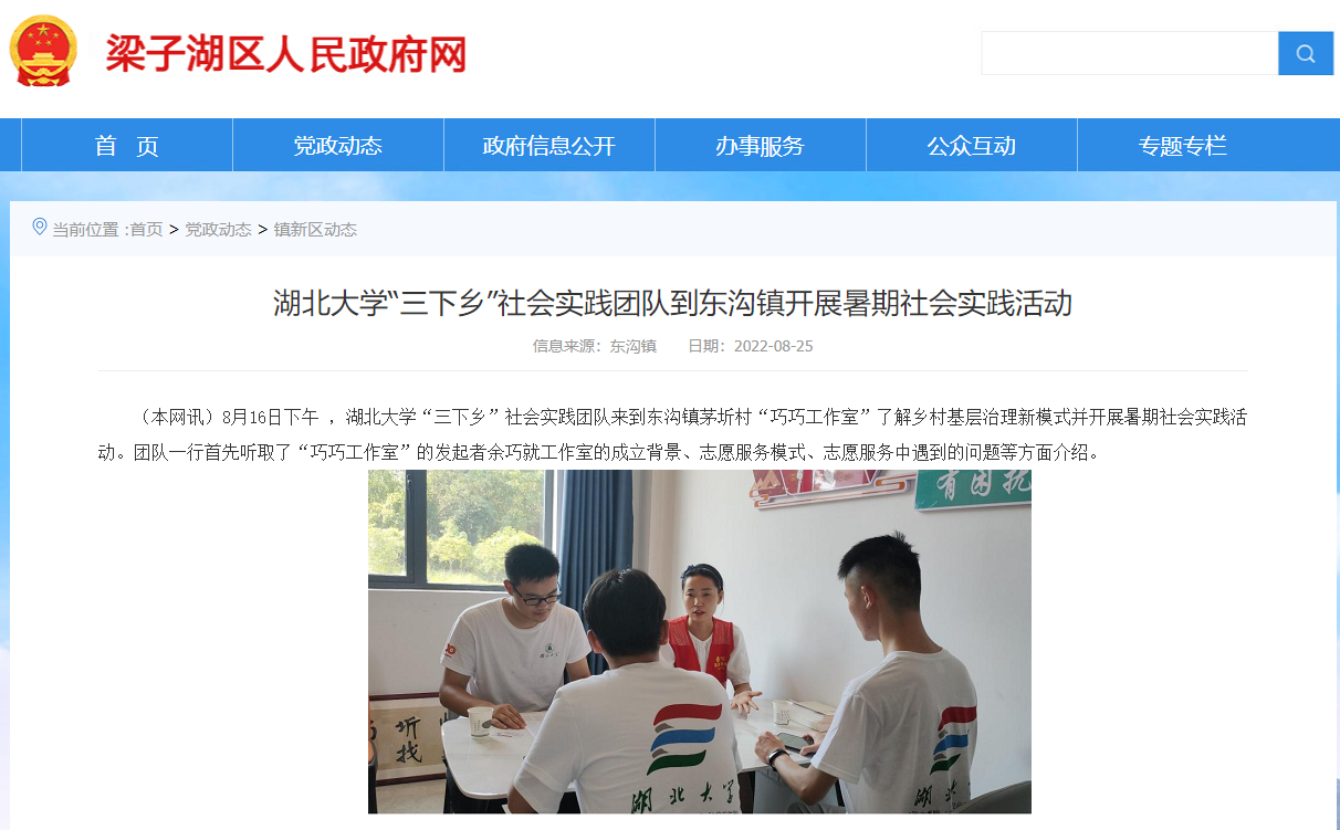本次社会实践的效果是十分明显的,不仅提供了一次能让我们深度了解新农村现状的机会,还让我学会了对一个目标任务,有针对性地提出问题,并且学会了如何用能获得的资源去分析和讨论问题。实践过程不仅锻炼了我的交际能力,还提高了我解决问题的素养水平,让我自身得到了相当大的提高——从发现问题、寻找办法再到解决问题,并在此过程中找到自身存在的问题再加以解决,从而形成一个更好的问题解决与目标实现的良性循环。特别是我们在探访当地的剪纸、根雕、玉连环、穿花龙舟、张裕钊文化和梁湖碧玉茶等特色文化和产业时,不仅感受到了当地文化的深厚积淀,还让我对文化传承有了新的认识。当然,此次实践活动给我一个很大的惊喜就是当地的基层治理新模式——巧巧工作室,这个是真真切切地在坚持全心全意地服务民众,实实在在地打通了与群众之间的最后一公里。我相信,在当地政府的奋力创新下,巧巧工作室一定能发挥更大的作用,甚至为全国基层治理提供新样板、新动力。