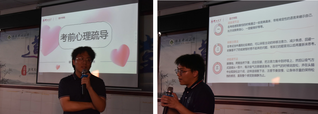 心理疏导活动:支教期间恰逢六年级的小升初考试及其他年级的期末考试,为缓解员工们考前的焦虑心理,我们针对全校五、六年级员工进行了考前心理疏导的主题班会,在通过班主任了解员工对考试焦虑程度的基础上,帮助员工树立正确的考试观,帮助员工掌握调节考试焦虑的方法。