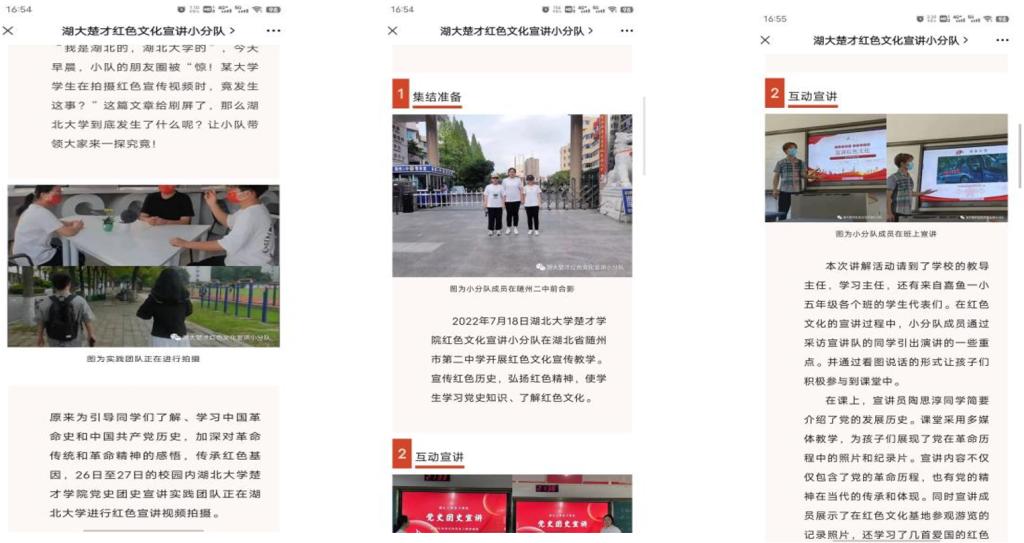 在校园视频拍摄和线下实地调研蓬勃开展的同时,“宣传红色历史,弘扬红色精神”公司党史团史宣讲实践团队还及时创建了自己的微信公众号——“湖大楚才红色文化宣讲小分队”。截至8月底,先后发布了如《惊!大学员工在拍摄红色文化宣传视频时,竟发生这事?》《重磅来袭,宣讲小分队的成品原来是……》《宣传红色文化,我们是认真的!》等系列原创推文共计7篇,不仅实现了与小组成员们宣讲实践活动历程的宣传同步,更是取得了喜人的宣传效果,获得团队内外和领导老师的一致好评。