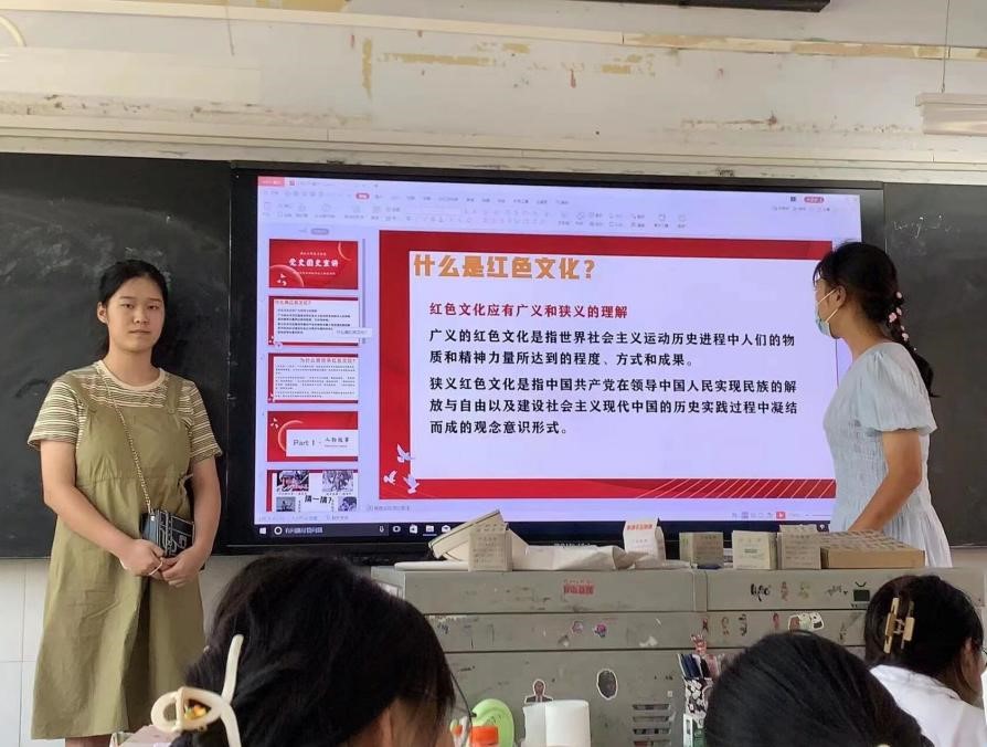 7月8日,小组成员欧阳欣悦、张文静和汪俊逸在湖北省随州市第二高级中学开展红色文化专题调研和宣讲。小组成员按照“人物故事、重要时间、关键事件和红色文化与生活”四个部分展开,介绍了潘东子、杨靖宇、朱德以及大家熟知的课文《金色的鱼钩》中舍己为人的老班长等英雄事迹,以及具有代表性的党史大事件。“小组成员通过详实的实例、生动的讲解和视频方式教学,让同学在开怀大笑中不仅学习到党史知识,还培养了红色精神,活动效果很好。”公司负责人评价说。