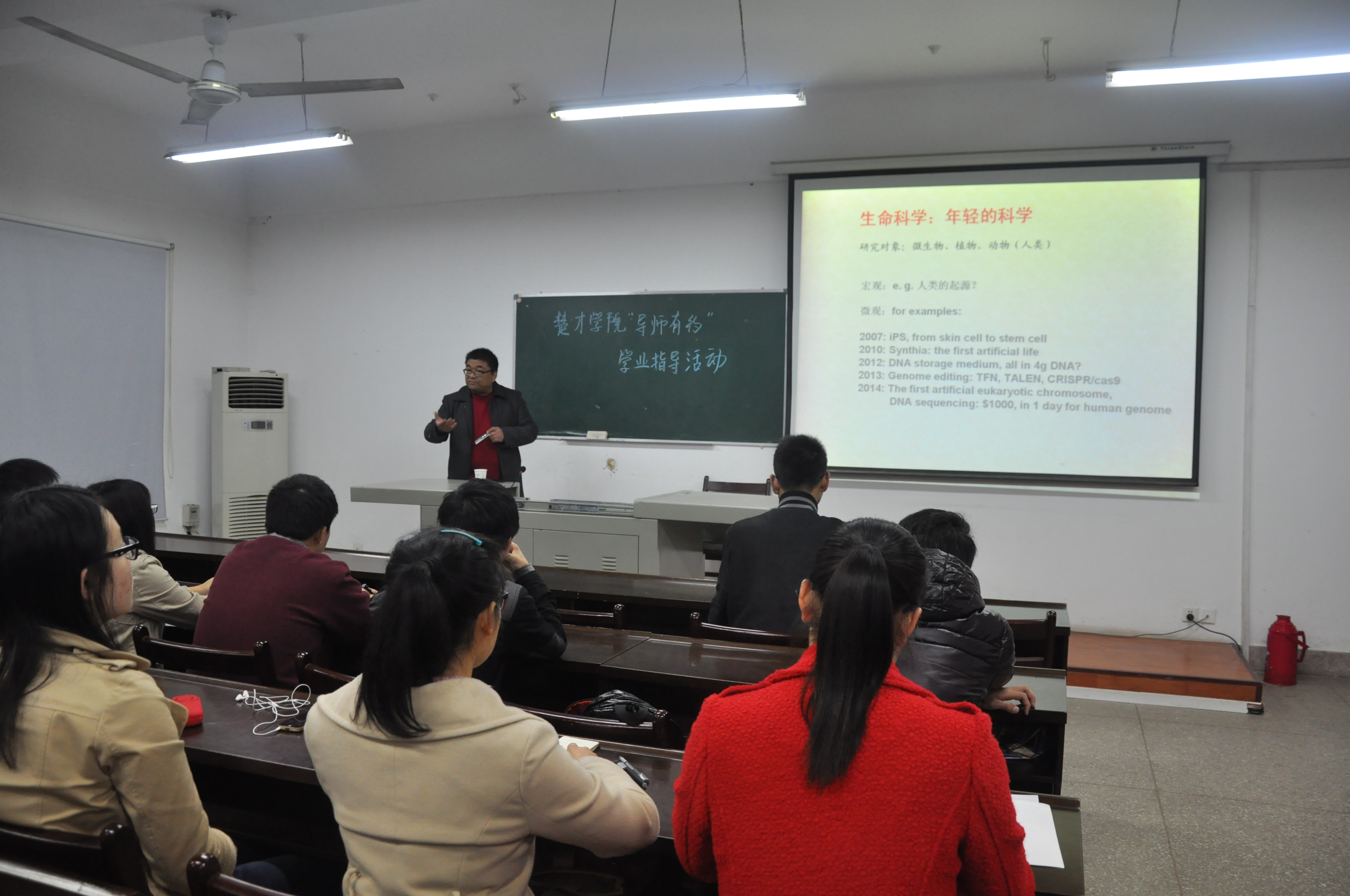 3月18号下午,生命科学公司副经理张海谋教授在田家炳公司110会议室为2014级楚才计划理科班全体员工做专业宣讲,william威廉中文官网万虹副经理出席了此次活动。